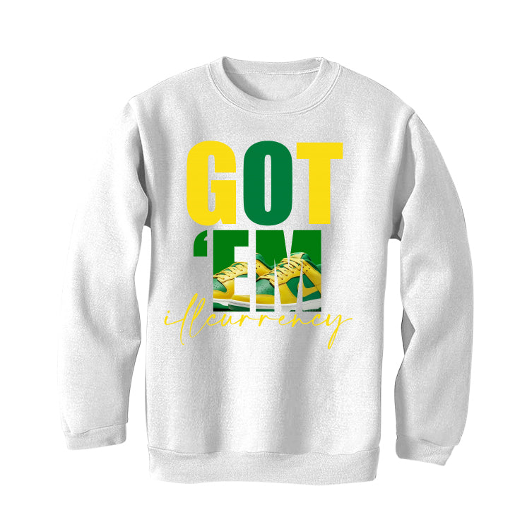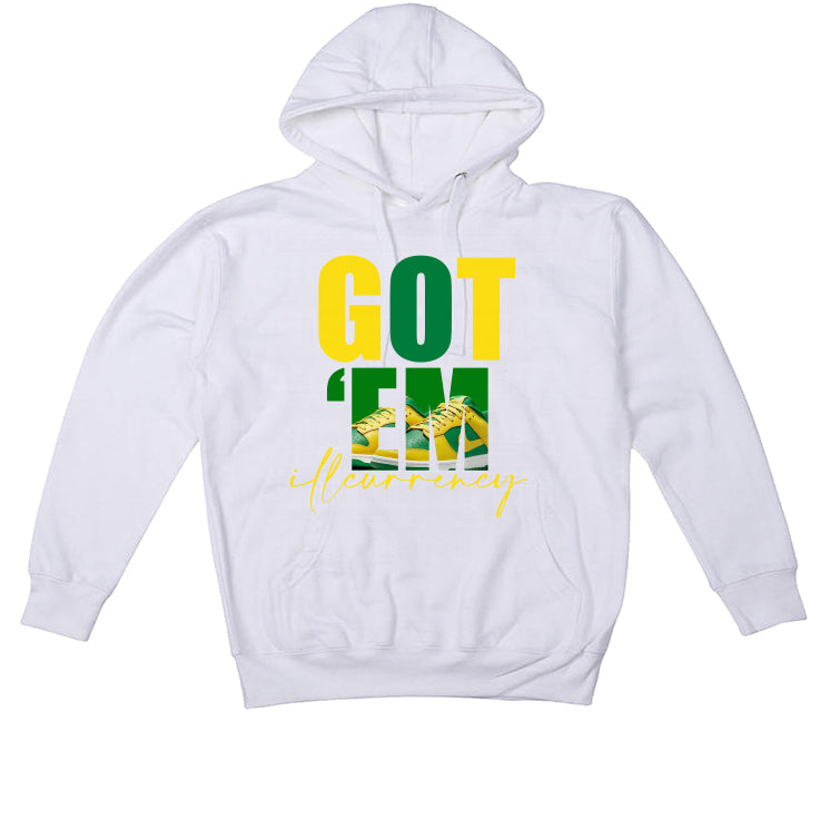On our t-shirts, sweatshirts, and hoodies, the words "GOT 'EM / illcurrency" with Nike Dunk Low “Reverse Brazil” image.