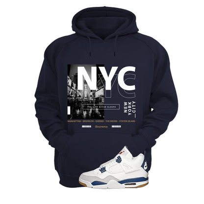 Nike SB x Air Jordan 4 Navy Navy Blue T-Shirt (City Never Sleeps)| illcurrency is a premium quality sneakerhead t shirt. It matches with the Nike SB x Air Jordan 4 Navy | illcurrency sneakers.