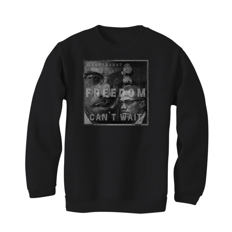 These t-shirts, sweatshirts, and hoodies say "ILLCURRENCY / FREEDOM / CAN'T WAIT" with images of Malcolm X.
