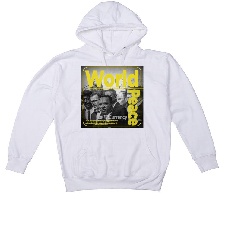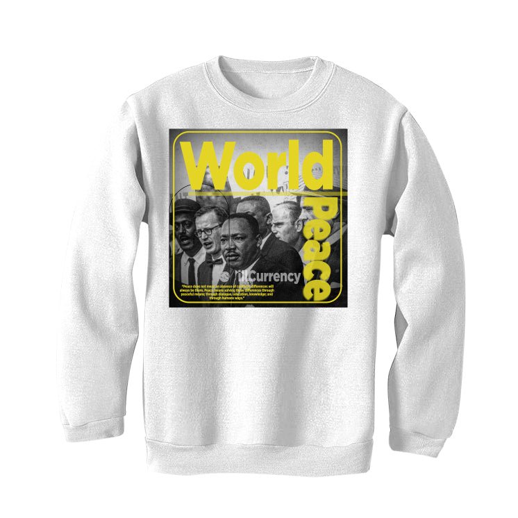 Our t-shirts, sweatshirts, and hoodies proudly display the phrase "WORLD PEACE," framed by images of Martin Luther King Jr. and other activists within a square border on their fabric.