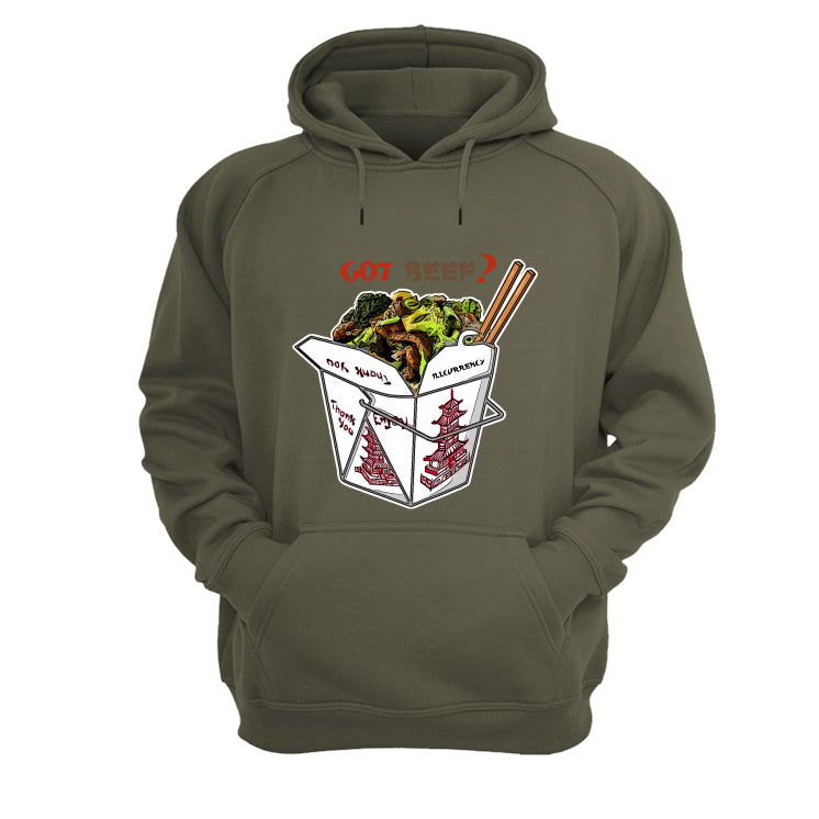 Our t-shirts, sweatshirts, and hoodies come with graphics of beef and broccoli in a Chinese takeout box, chopsticks, and the phrase "GOT BEEF?"