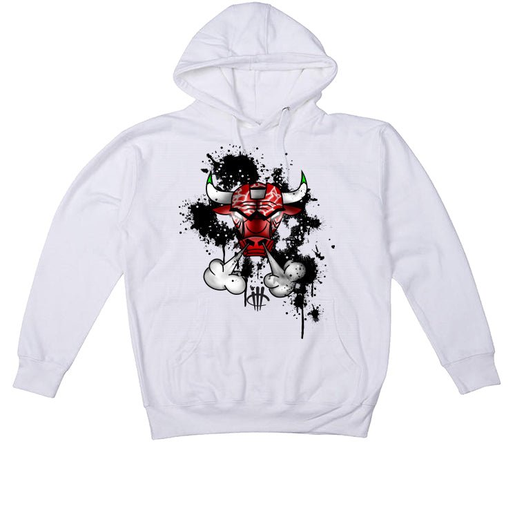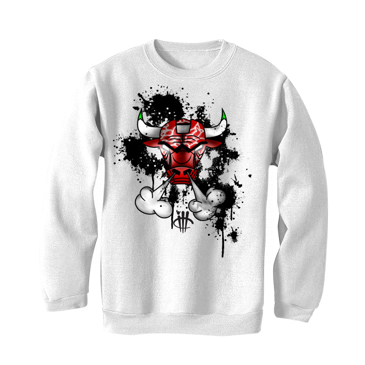 Our Jordan 13 Playoffs outfit collection of t-shirts, sweatshirts, and hoodies features a graphic of a cartoon bull head with glowing eyes amidst smoke and ink splatters.